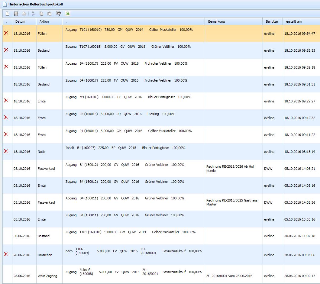 Klicken Sie zum Löschen einer Aktion auf das rote X vor der Aktion. Hinweis: Wenn Sie bei einer Aktion das rote X nicht sehen bedeutet dies, das bereits eine Nachfolgeaktion stattgefunden hat. Sie müssen in diesem Fall die nachfolgende(n) Aktion(en) löschen. Diese Vorgehensweise ist im Zusammenhang mit der Rückverfolgung notwendig.