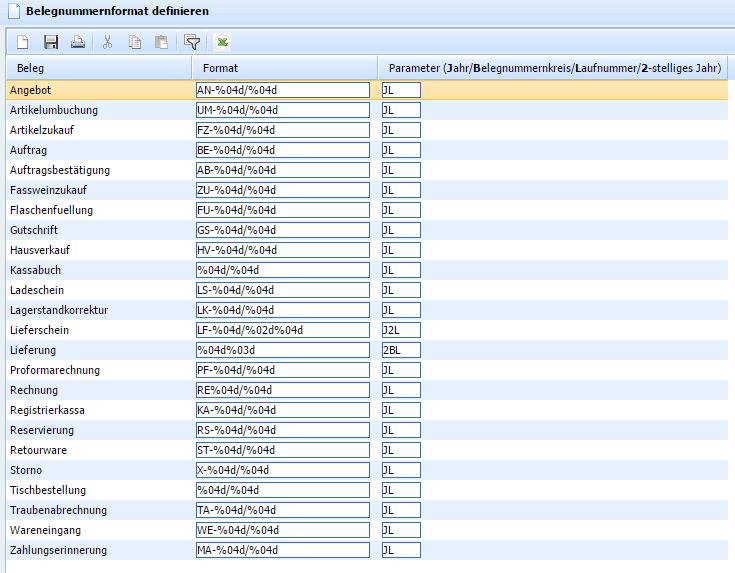 Mit Hilfe der Funktion können Sie das Format der Belegnummer pro Belegart definieren. Verwenden Sie dazu die Spalte Format und Parameter. Zur Erklärung der Syntax wenden Sie sich bitte an einem Mitarbeiter des Kellerbuch-Teams.
